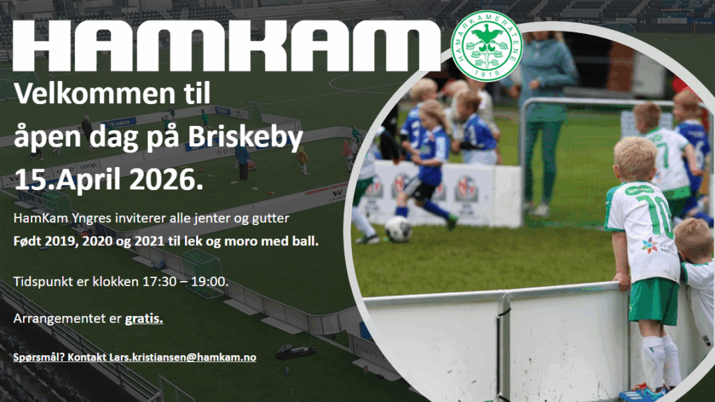 HamKam Yngres ønsker velkommen til åpen dag på Briskeby onsdag 15. april fra klokken 17:30-19:00. Alle gutter og jenter født 2019, 2020 og 2021 hjertelig velkommen til lek og moro på Briskeby.
